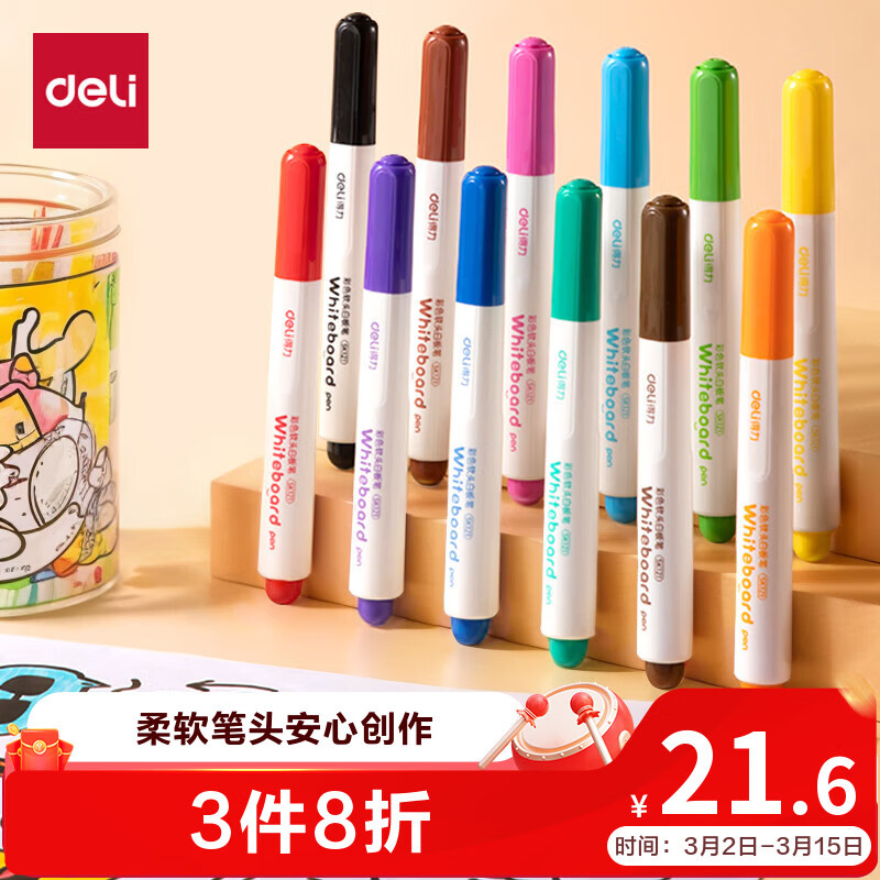 得力儿童彩色可擦白板笔 12 支仅需 2.78 元