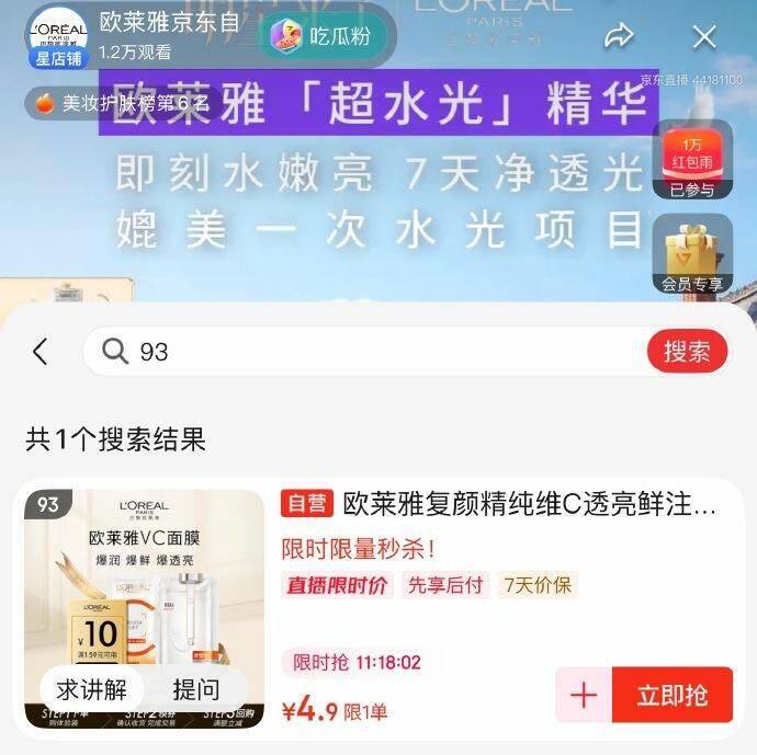 欧莱雅直播间红包雨来袭!2 元抢复颜精纯维 C 面膜