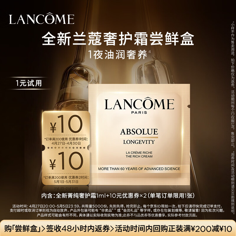 试用20点抢兰蔻菁纯霜等大牌美妆,0元领正装体验
