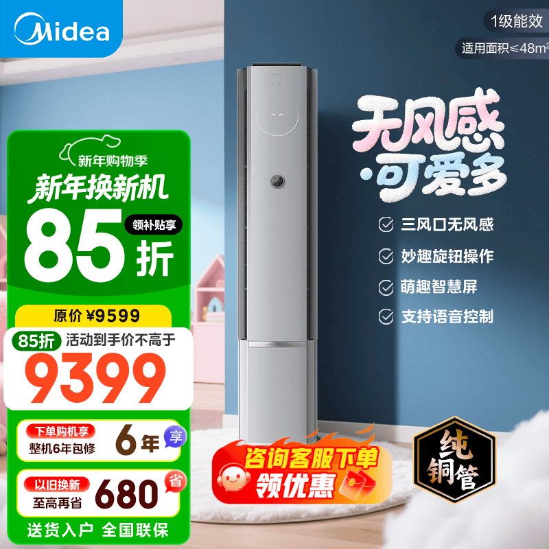 ¥9389 美的空调 3匹 云朵系列 AI无风感 超一级能效 母婴级净护 家用立式空调柜机 国家补贴 以旧换新 可爱多 大3匹 会唱歌的空调 9399