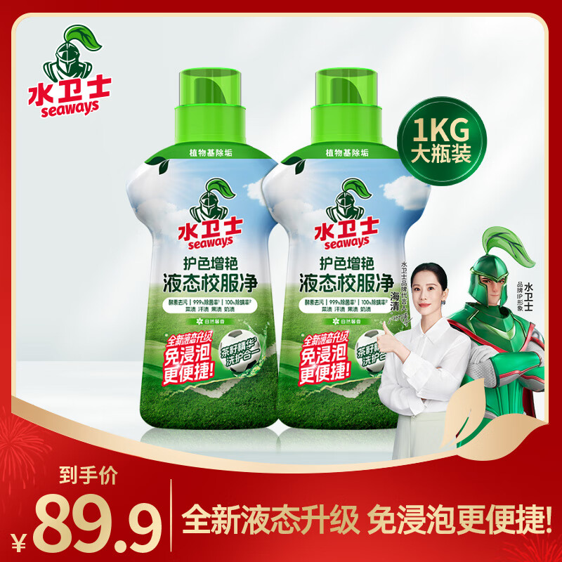 ¥39.9 水卫士液态校服净洗衣去污渍彩漂彩色衣物通用去黄除菌液态新升级 液态校服净1kg*2瓶 89.9