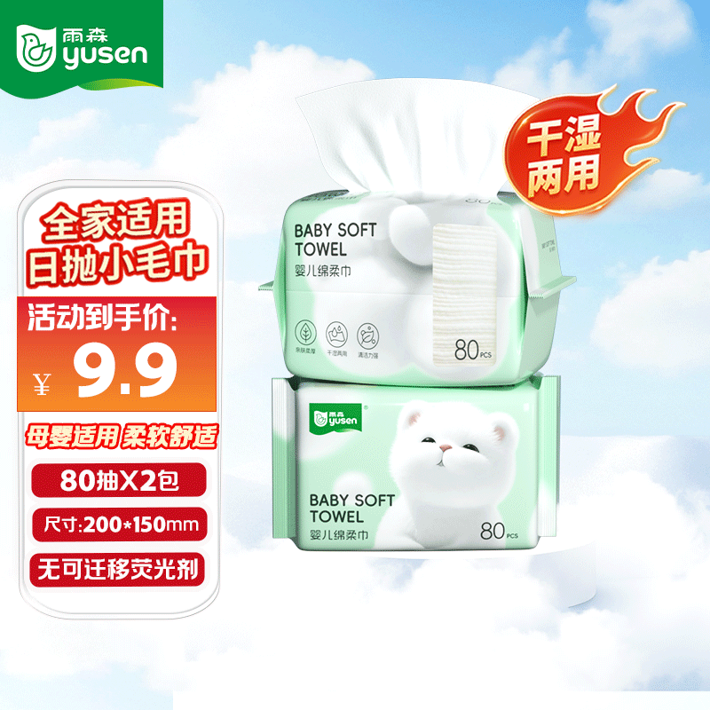 雨森洗脸巾 80 抽*2 包仅需 6.9 元