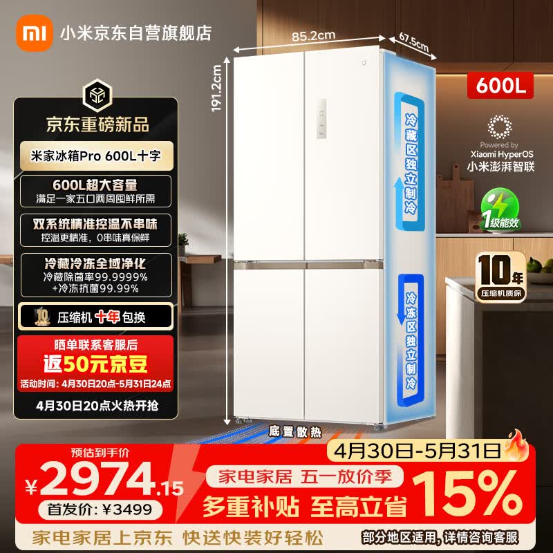 米家小米双系统600升十字电冰箱到手价3499元