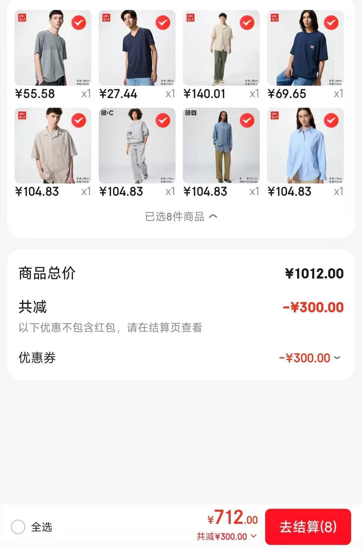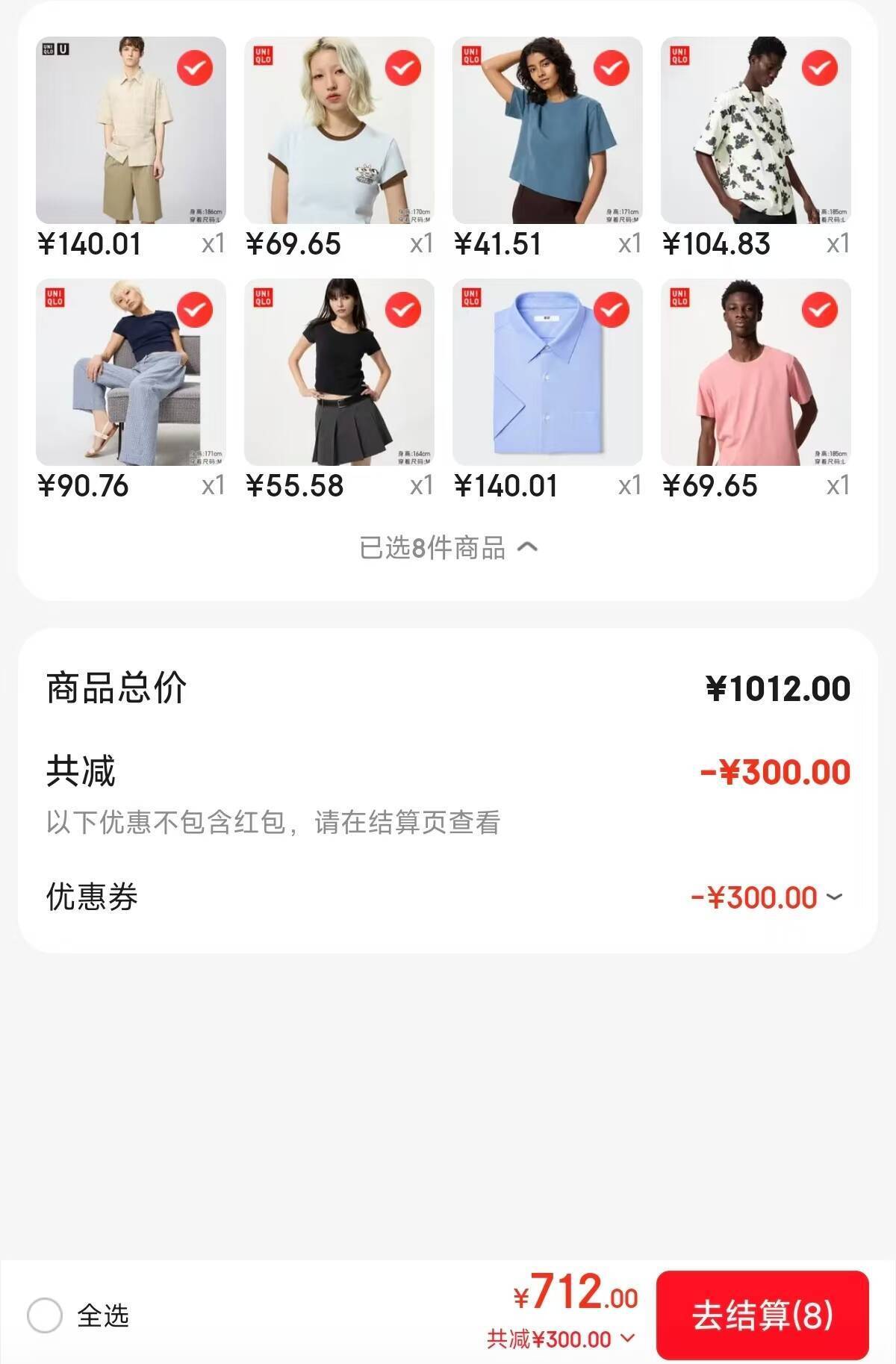 优衣库格子衬衫140元+印花T恤69元,领1000-300大额券叠加更划算