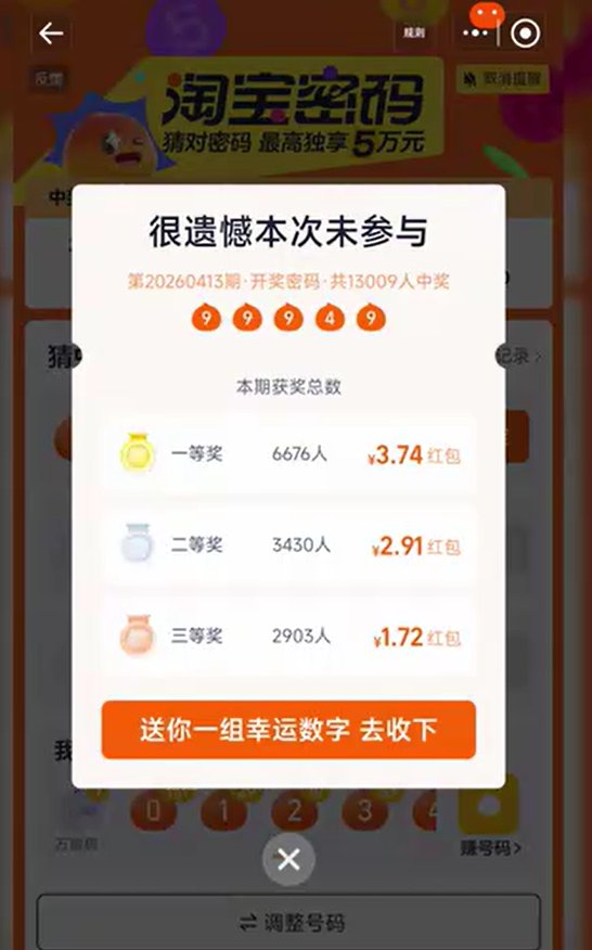 - 活动入口:打开淘宝APP,搜索关键词“淘宝密码”即可进入活动页面,输入预测答案参与活动,注意活动截止时间(常规为每日19点截止,21:30开奖)。
