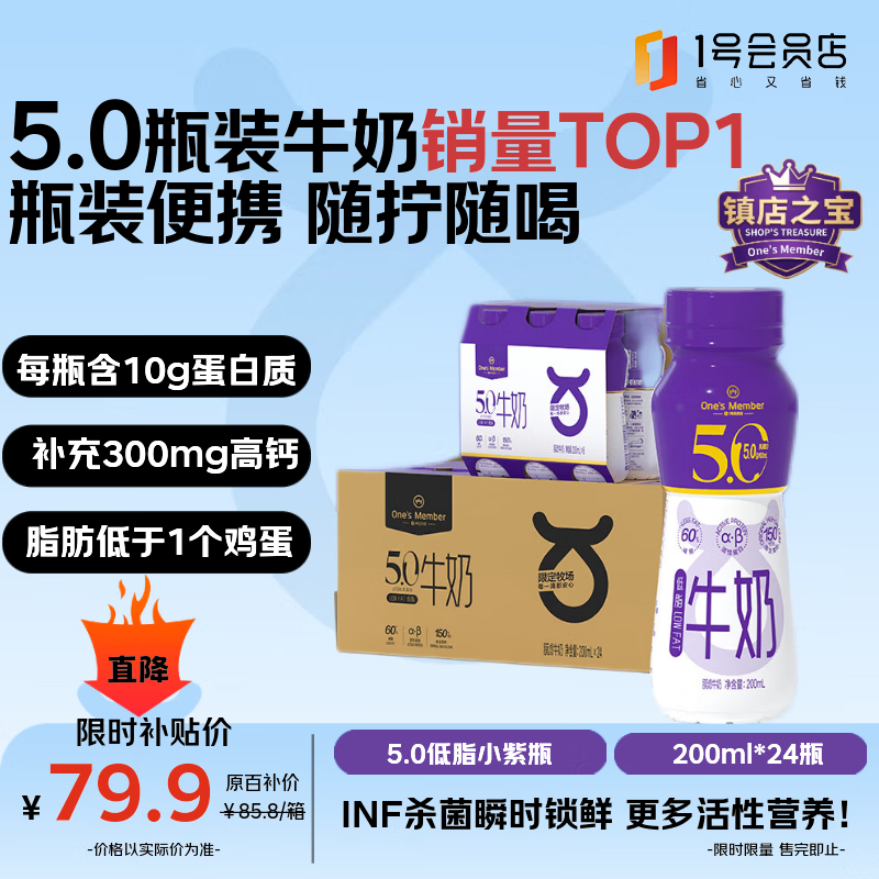 1号会员店低脂牛奶首购2件仅154.8元,折合3元/瓶还返7.99元卡