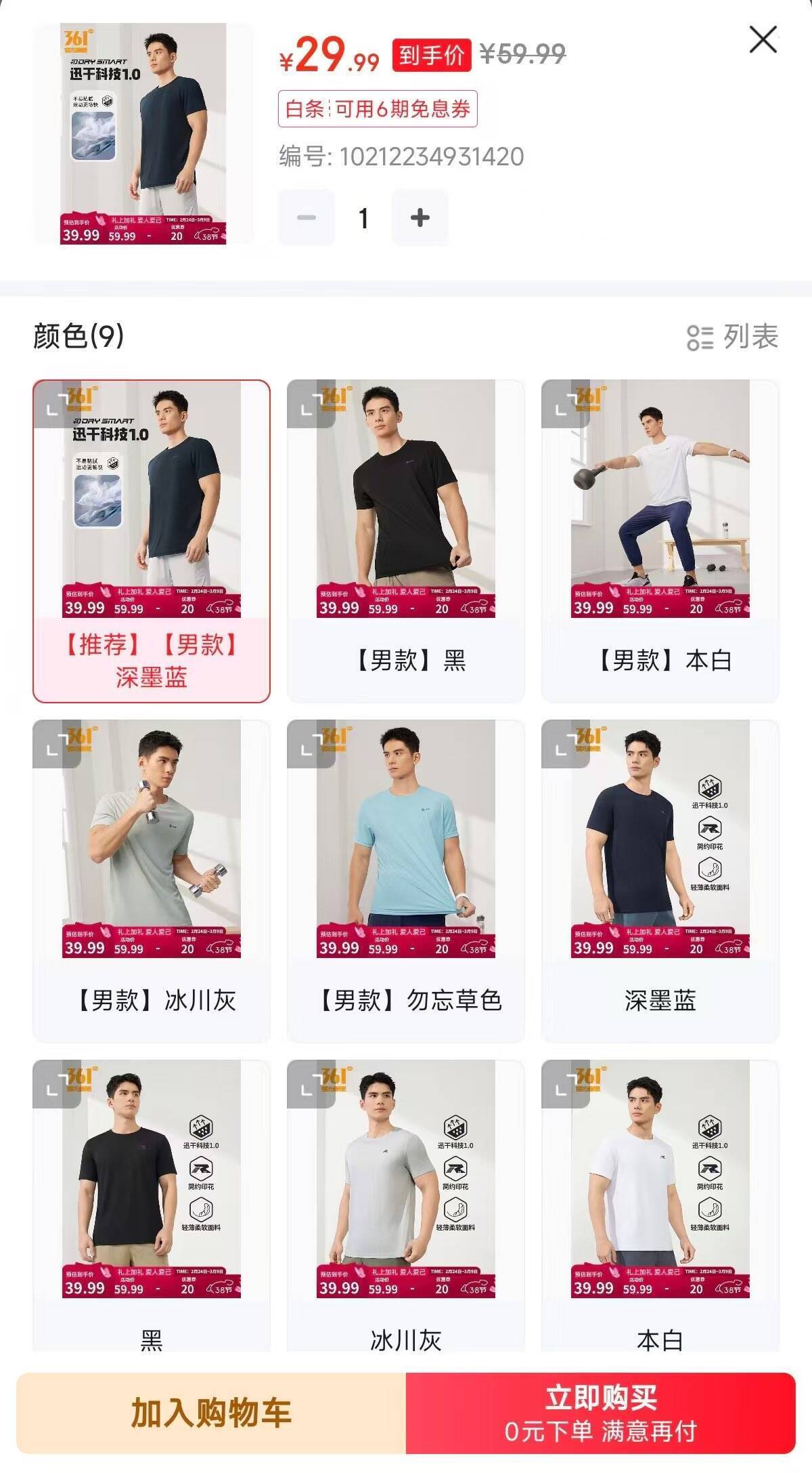 361 度速干 T 恤仅需 29.9 元,夏日运动必备!