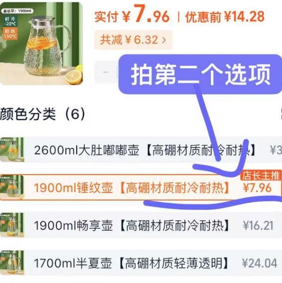 1900ml 超大容量锤纹冷水壶仅需 7.9 元
