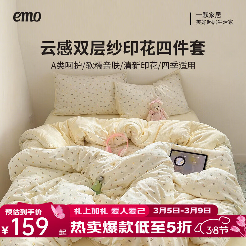 ¥147 一默四件套2026款A类古法水洗仿棉云感纱被套床单床笠枕套家用四件套 花集小兔 2.0m 床单款 (被套200*230cm) 四件套 229