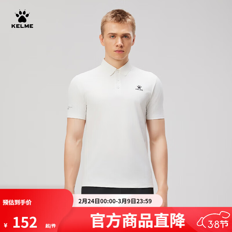 ¥102 卡尔美(KELME)运动POLO衫男夏季新款健身短袖翻领速干T恤通勤上衣 光亮白 XL 152