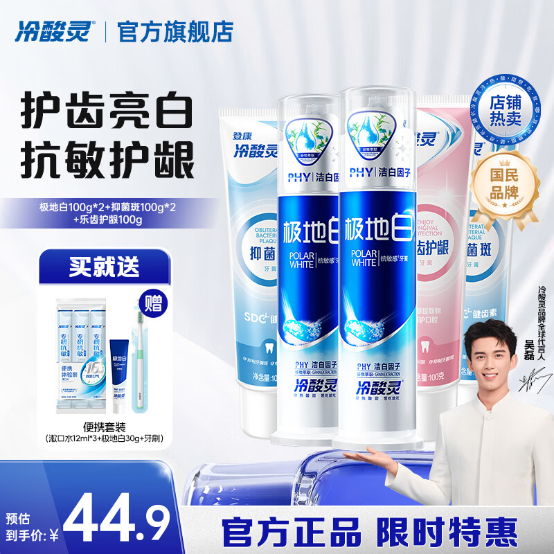 ¥28.9 冷酸灵泵式直立式海洋薄荷香型美白牙齿国货【吴磊同款】按压抗敏感牙膏 极地白2支+乐齿护龈1支+抑菌斑2支 500g*1套 44.9