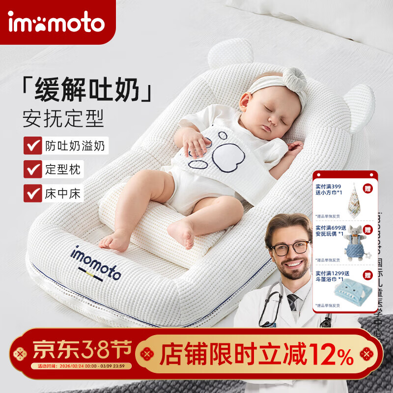 ¥272 IMOMOTO婴儿斜坡枕床中床新生儿防吐奶防溢奶防呛奶可调节防惊跳躺喂神器 0-1岁 小熊威尔 0-30°三档调节(可拆洗) 282