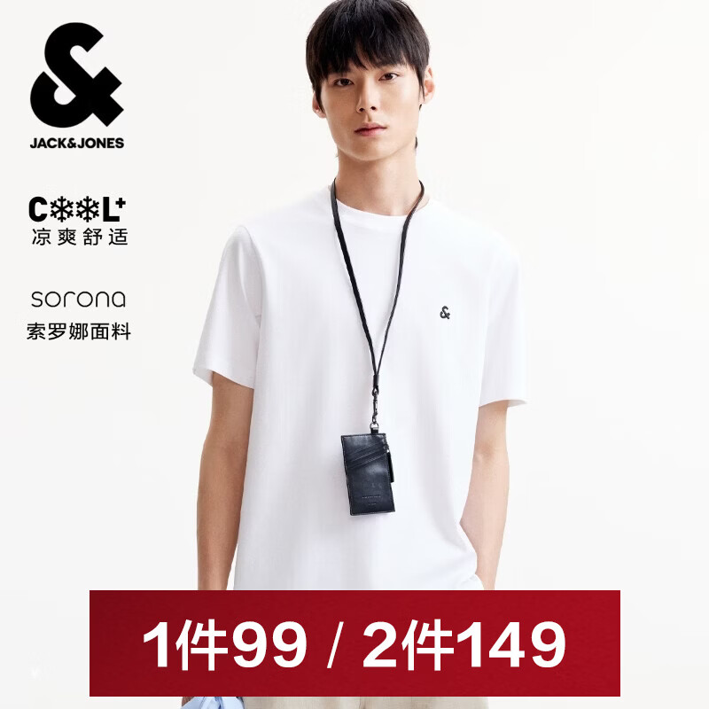 ¥99 杰克·琼斯(JACK&JONES)26年男装四季打底T恤男士凉感透气多色情侣款短袖t恤水洗不易走形 白色A06 M 175 149