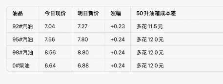 92/95/0#每升涨0.23-0.24元,加满50升多花11.5-12元,现在加油最划算,提前加满油箱哈