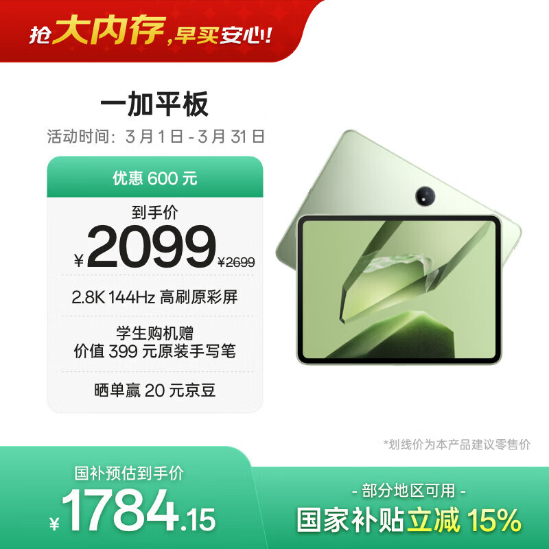 一加平板12GB+256GB国补后仅1486元,办公游戏学习全能神器