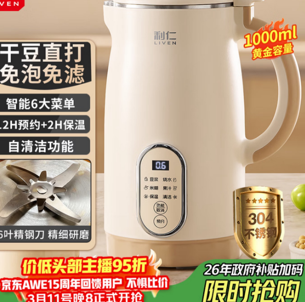 利仁豆浆机Plus会员叠加国补仅需83元,16叶精钢刀免滤直打