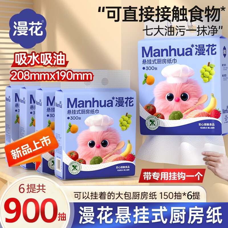 漫花悬挂式厨房纸巾150抽*6提,到手仅需26.99元
