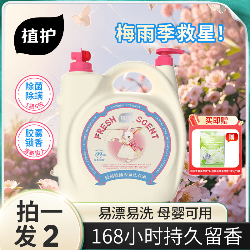 ¥39.9 植护香氛洗衣液 10斤大大桶持久留香 除菌除螨深层洁净 家用整箱装 粉雾兔绒10斤*1瓶(赠清洁剂) 69.9