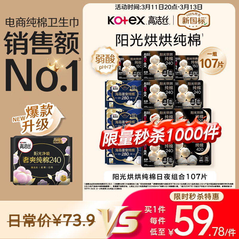 自营高洁丝纯棉卫生巾107片组合,到手价仅59.7元