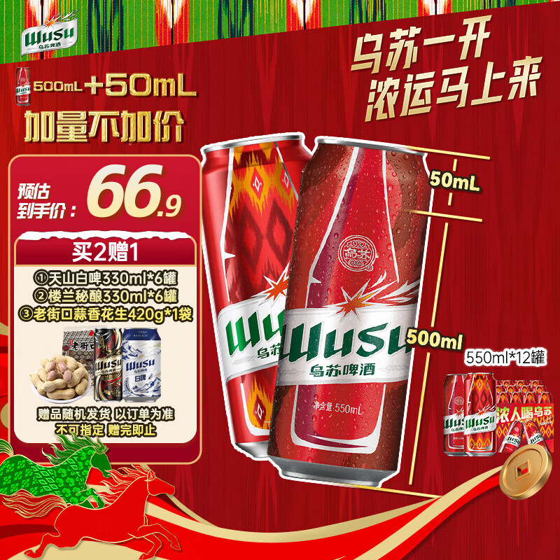 自营乌苏啤酒550ml*12罐整箱装,PLUS叠首购仅需56.6元