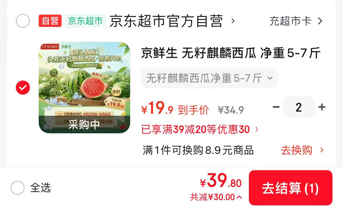 无籽麒麟西瓜2粒装,最终到手价39.9元