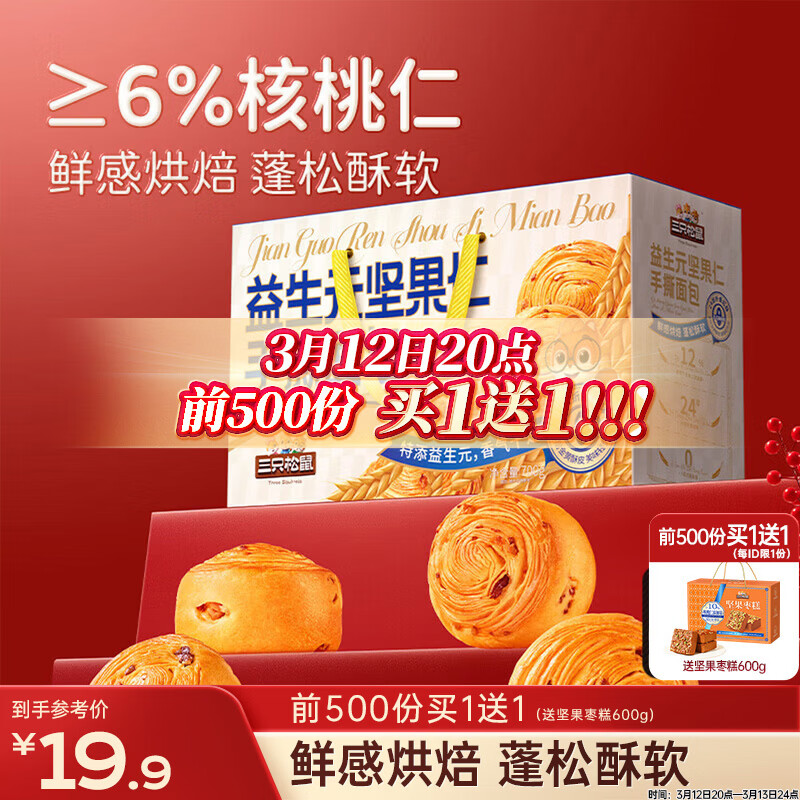 三只松鼠手撕面包700g礼盒装,专属价9.9元买一送一