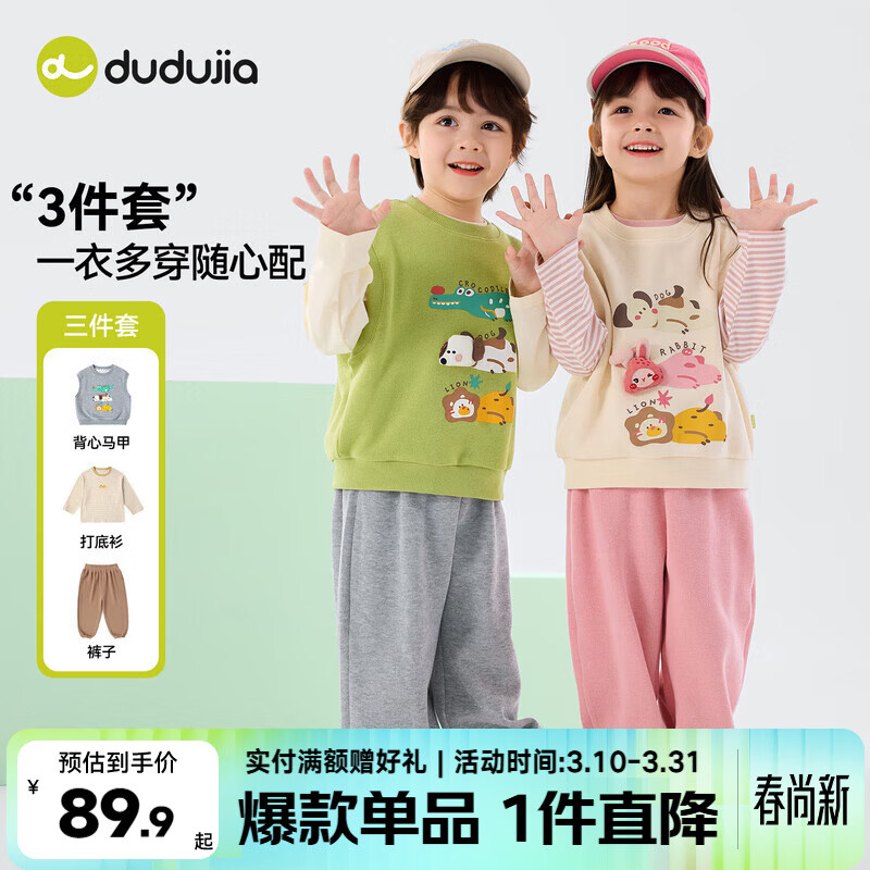 ¥92.55 嘟嘟家儿童春季长袖套装男童百搭三件套春装女童透气打底衫休闲卡通马甲 牛油果绿 90 102.9