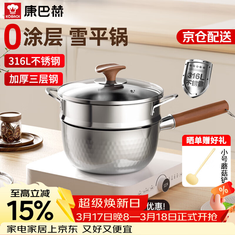 康巴赫316L雪平锅带蒸笼 最终到手价126.4元