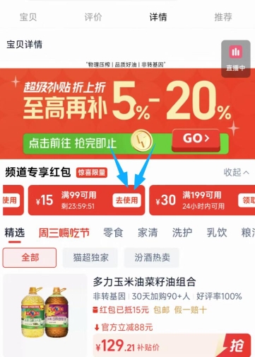 商品页价格下方-领199-20超市券(需88会员),下滑详情,进超级补贴页面领99-15红包,找到商品下单,实付129元包邮;