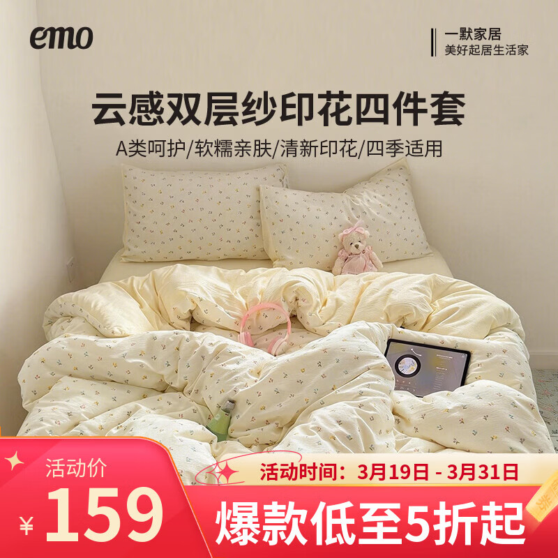 ¥186 一默四件套被套床单床笠枕套A类可裸睡床上用品云感双层纱印花四件套 樱桃布丁 2.0m 床单款 (被套200*230cm) 四件套 219