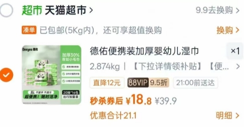 德佑婴幼儿湿巾便携装 16包到手价18.8元