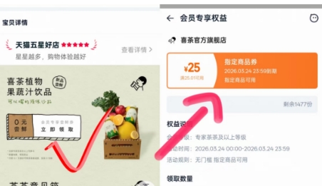 淘宝喜茶老会员专享:植物果蔬汁3瓶免单券速领