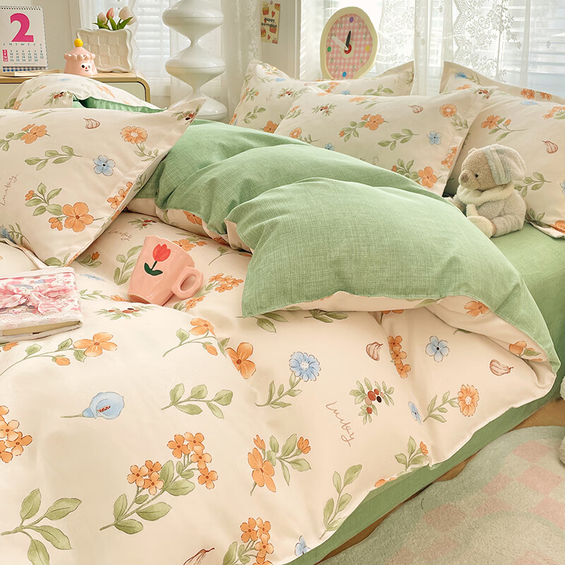 ¥69.9 羽匠春季少女小清新印花四件套学生宿舍套件家用床单柔软四件套 春田花花 床单款 床四件套(被套200*230cm) 99.9