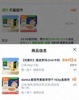 1、天猫超市首页分别搜索:臻选美食品类金、零食(领3元品类金,以超市卡形式抵扣,共6元)