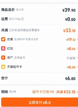 活动售价39.9元,立减15元优惠活动,商品页下拉页面进入“超级补贴”加入购物车1件,叠加5元福袋红包和88会员+上方15-3元券+6元品牌金,主商品实付6.8元包邮(淘金币默认减1.99实付4.17元包邮,截图没使用淘礼金),注:15-3红包需超级补贴加入购物车才能用,如有闪购红包3元就不需要领);