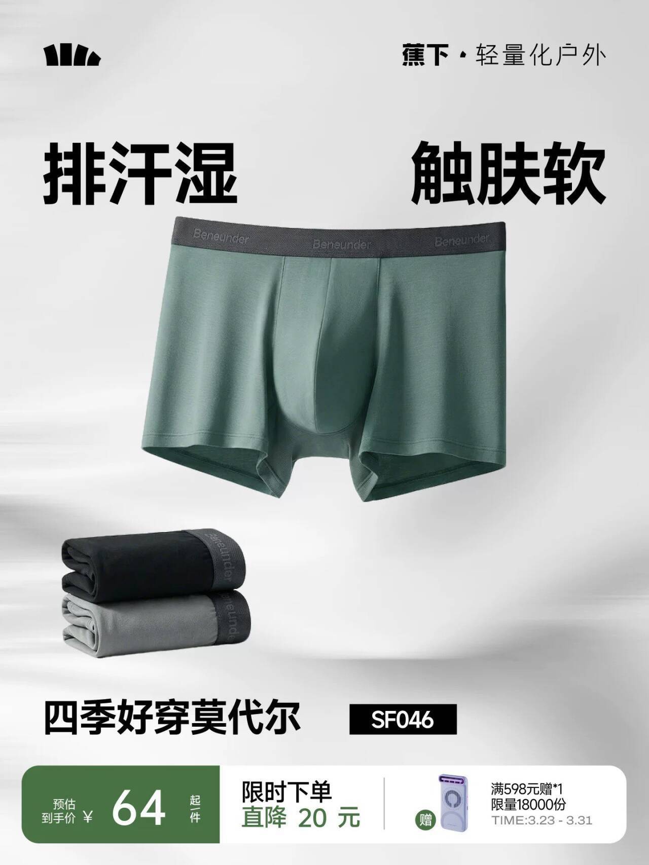 蕉下莫代尔抗菌内裤3条仅需48元
