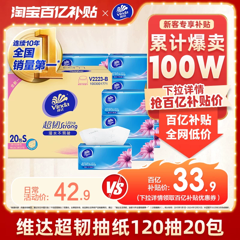 ¥29.61 【3层120抽20包】维达超韧抽纸 30.61