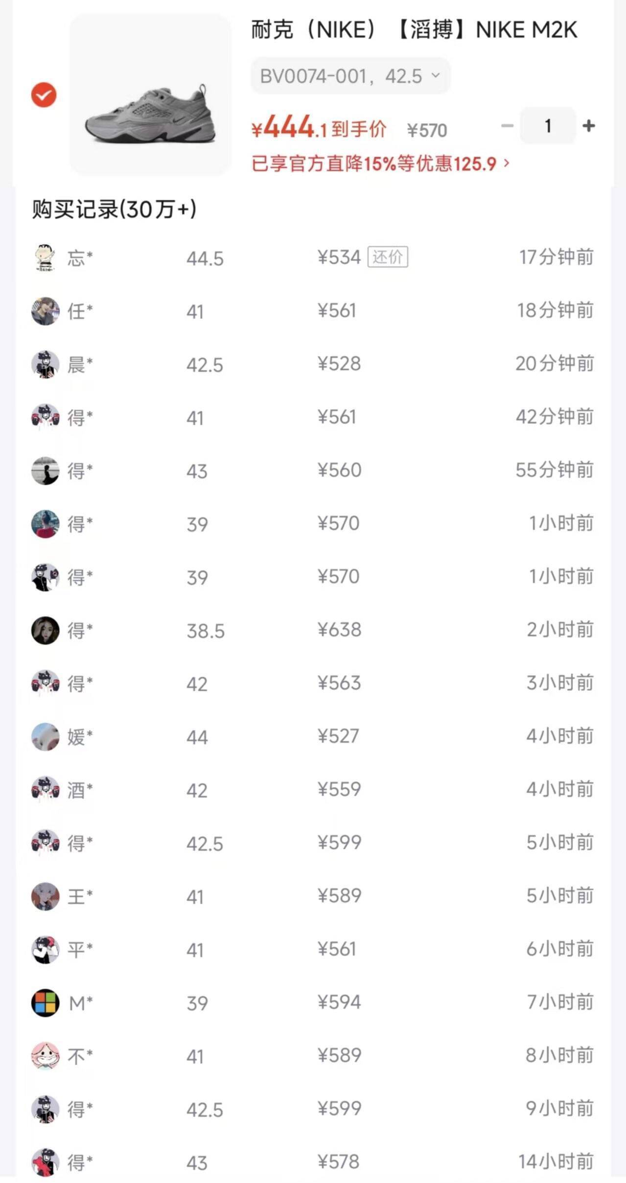 耐克M2K灰色 到手444元