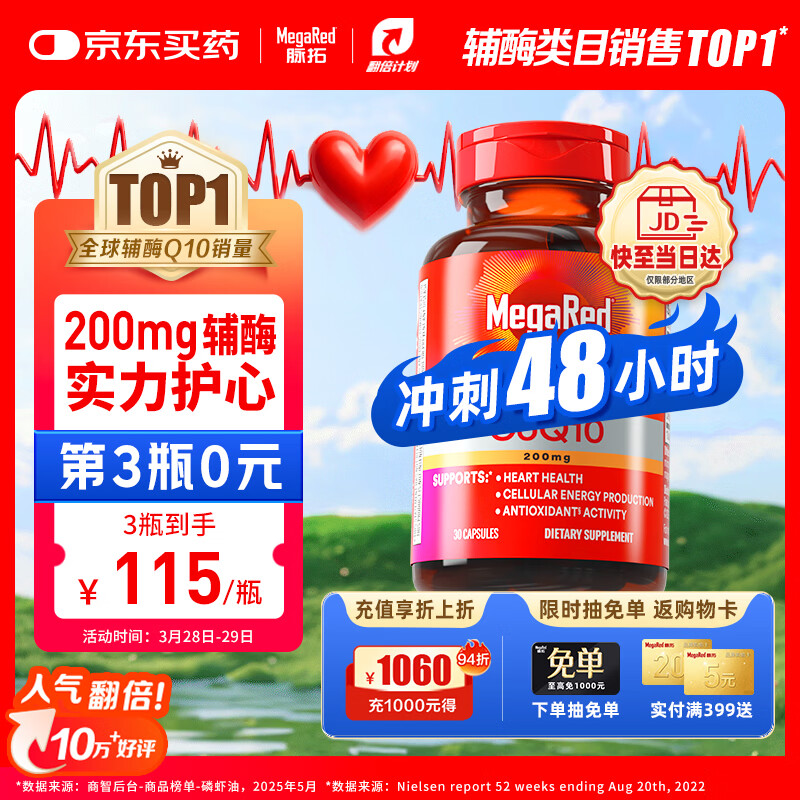 MegaRed脉拓辅酶Q10胶囊200mg*30粒 首购拍4件到手414元折103.5/瓶