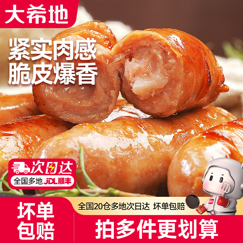 ¥25.9 大希地脆皮火山石烤肠原味肉肠早餐热狗烧烤空气炸锅食材香肠冷冻食品 脆皮烤肠【原味+黑椒味】20根 1kg 34.9