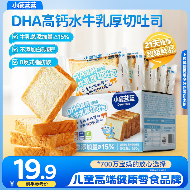 ¥12.9 小鹿蓝蓝厚切吐司面包黄油吐司片宝宝零食3-6岁早餐独立包装吐司 【早餐爆款】DHA高钙水牛乳吐司1箱/260g 29.9