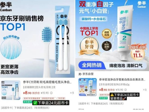 参半牙刷/牙膏任选1款买3件仅需26.71元,再返24元超市卡