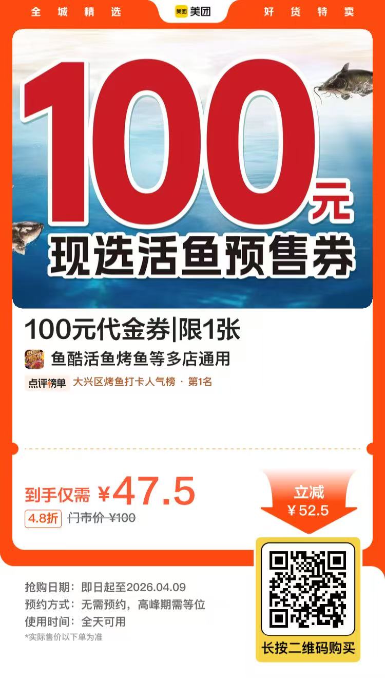 鱼酷活鱼烤鱼45折!45元买100代金劵