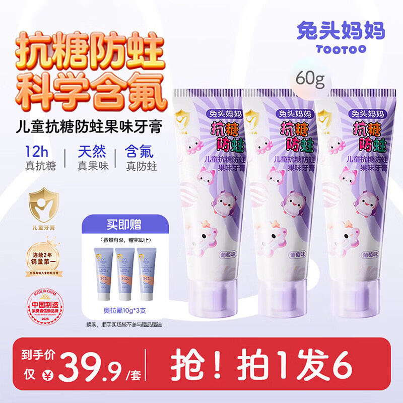 自营兔头妈妈儿童抗糖防蛀牙膏60g*3支,Plus叠首购仅需19.91元