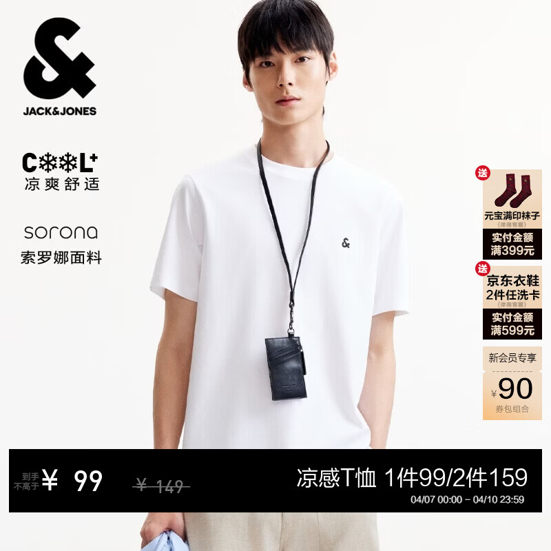 ¥99 杰克·琼斯(JACK&JONES)26年男装四季打底T恤男士凉感透气多色情侣款短袖t恤水洗不易走形 白色A06 M 175 149