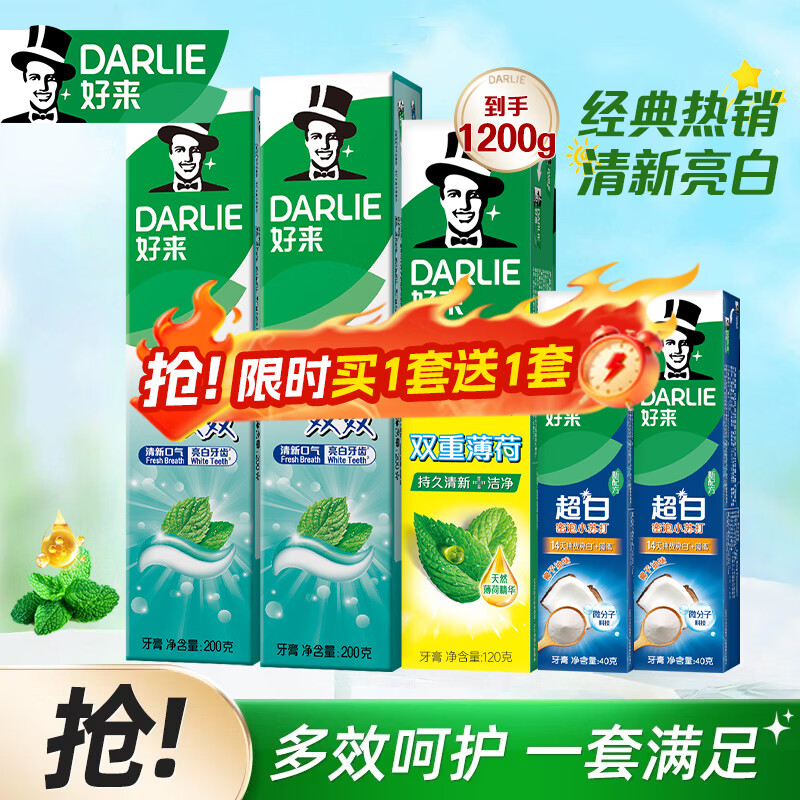¥39.9 好来(DARLIE)黑人双重薄荷牙膏茶香护龈固齿清新口气含氟牙膏成人 超白双效薄荷共600G 49.9
