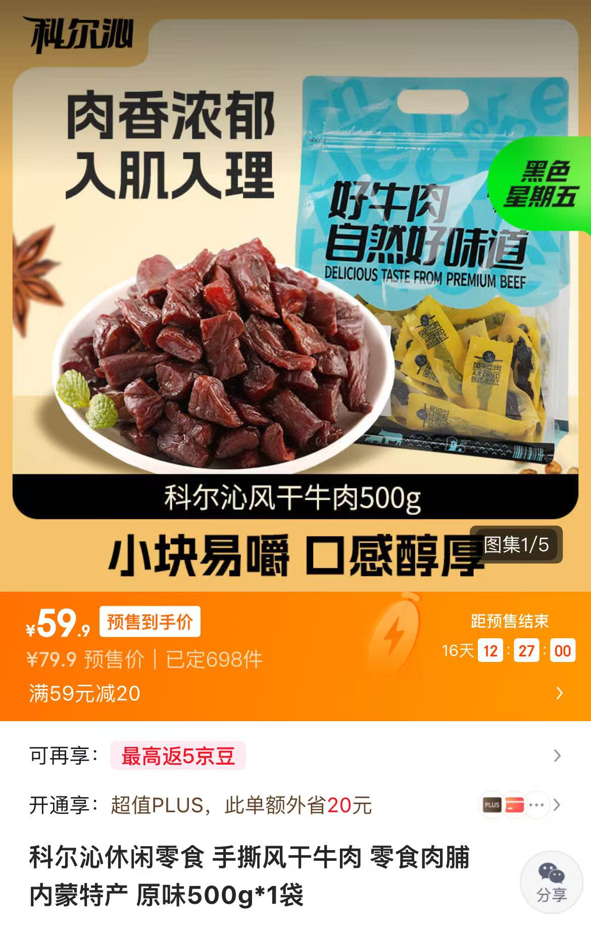 科尔沁手撕风干牛肉500g,最终到手价59.9元