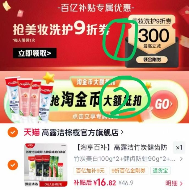 商品页价格下拉详情页-百亿补贴抢美妆洗护9折券,在去商品页价格下拉详情页淘金币点进去-淘金币 页加购,叠淘金币,实付16.9元包邮;