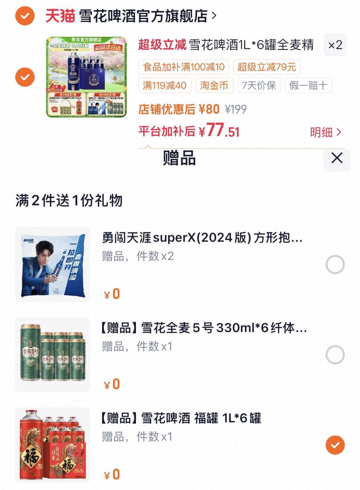 雪花全麦精酿啤酒1L*6罐*2箱,叠加优惠后仅需155元还送福罐