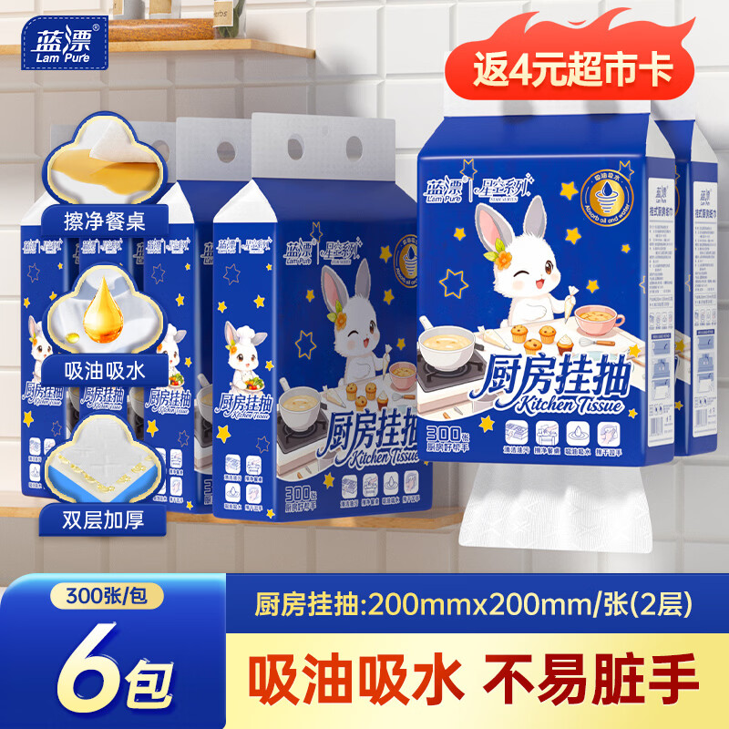 自营蓝漂厨房悬挂式抽纸 2层150抽*6提 折后4.1元/提